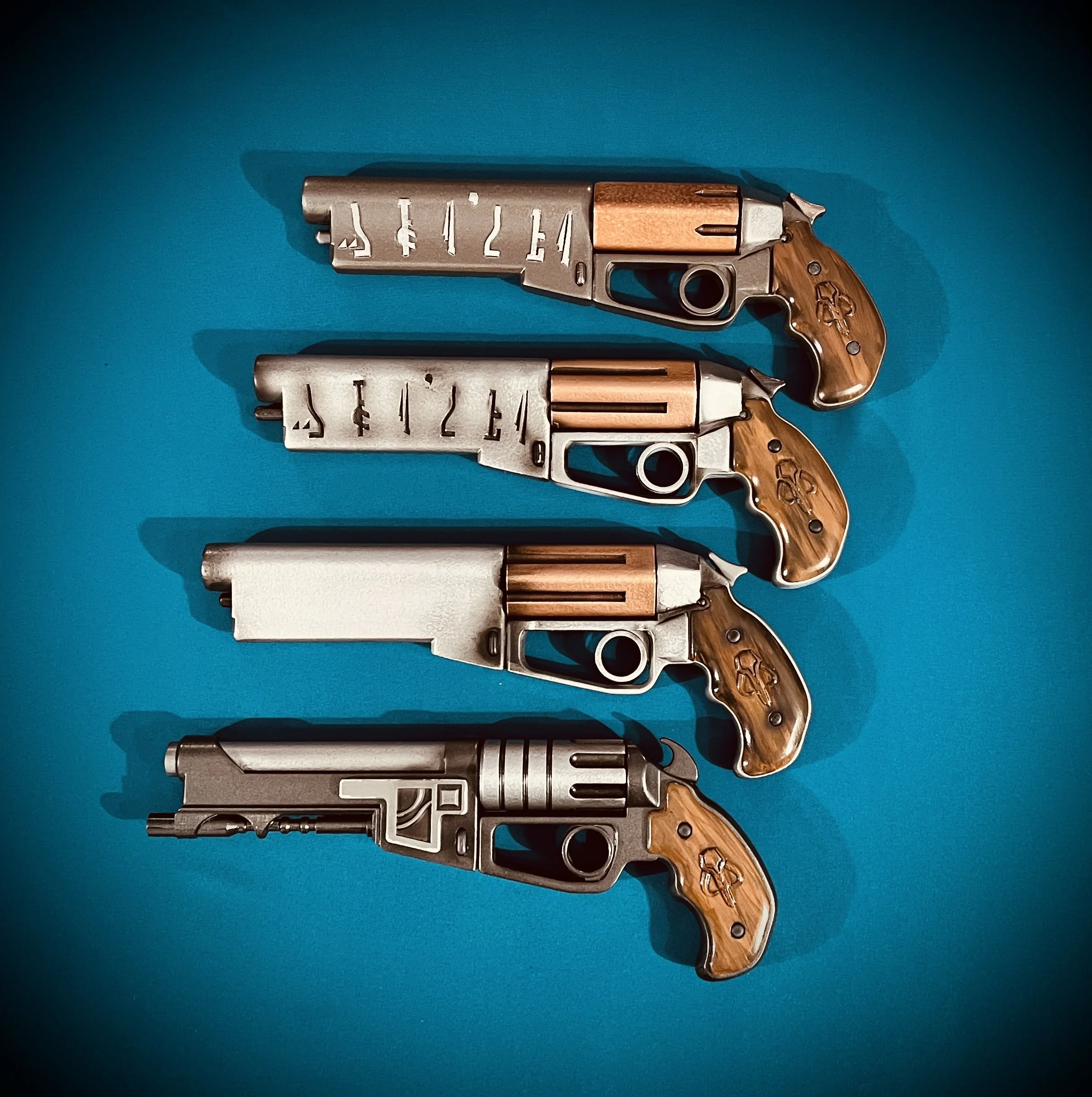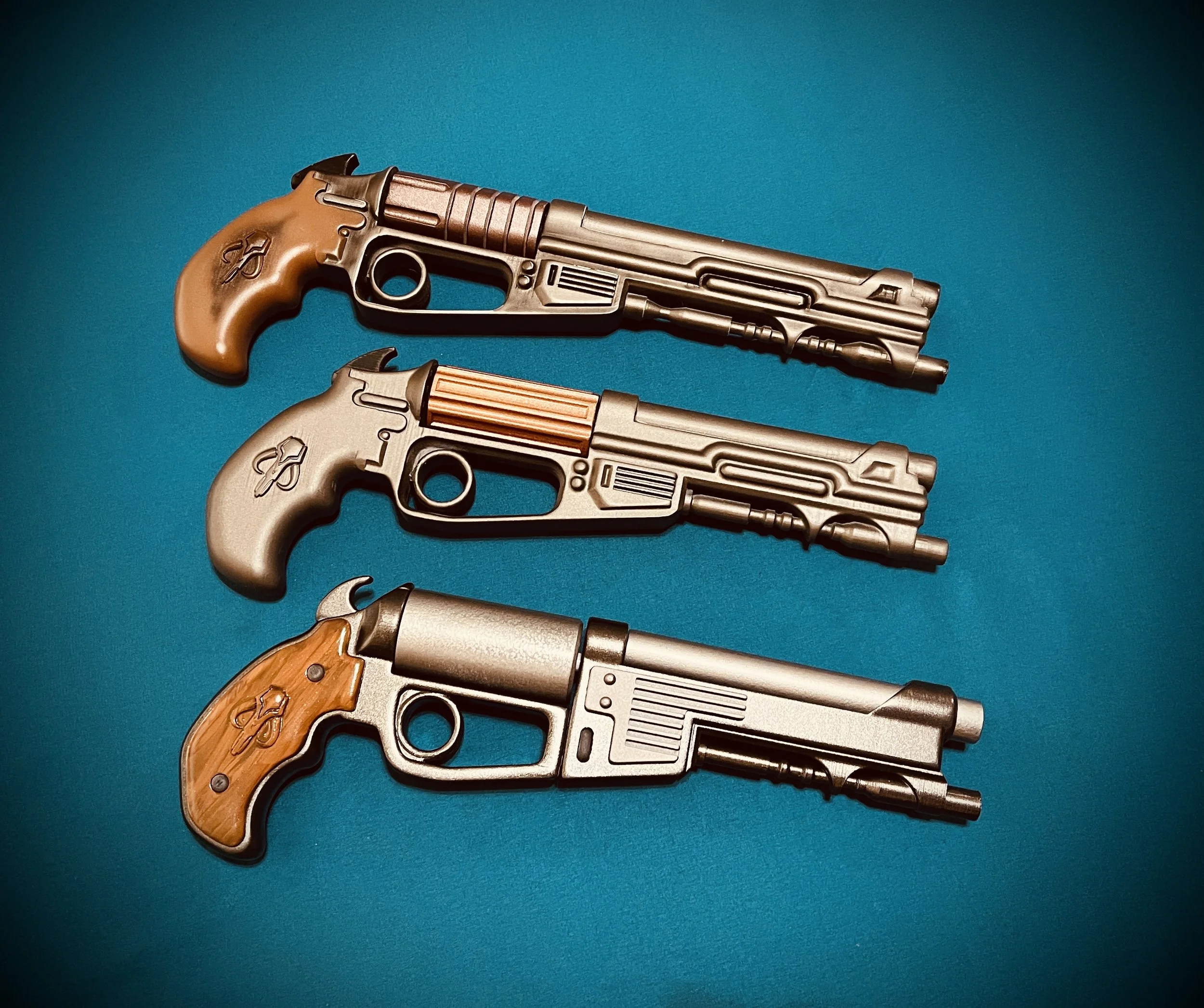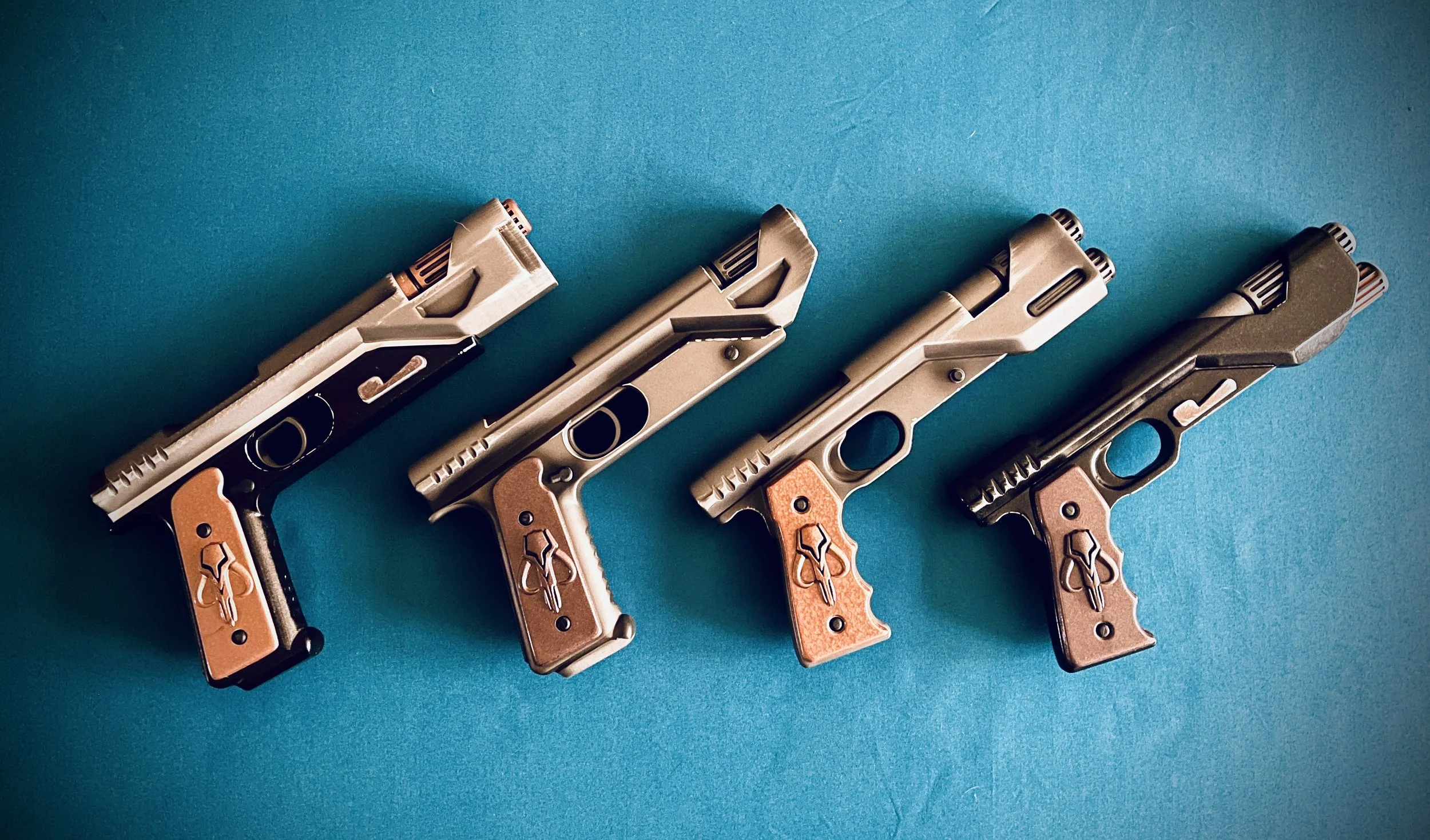 This is a file package for a set of Compact Westar Blasters with suppressors. The blasters vary slightly to give you some options. Simple print package requiring minimal supports. Want to up your Mandalorian Cosplay and stand apart, these are the blasters for you.